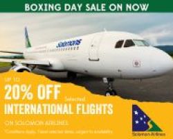 Solomon Airlines has announced a Boxing Day Sale with savings up to 20% off best available year-round fares on five of the airline’s popular international routes.