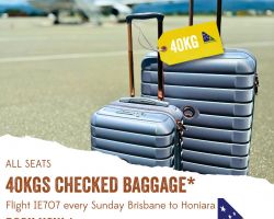Solomon Airlines is thrilled to introduce a special treat for our valued economy passengers on flight IE707 from Brisbane to Honiara every Sunday. Starting from October 13th, you can enjoy an increased checked baggage allowance of 40kg—that’s an extra 10kg just for you!